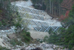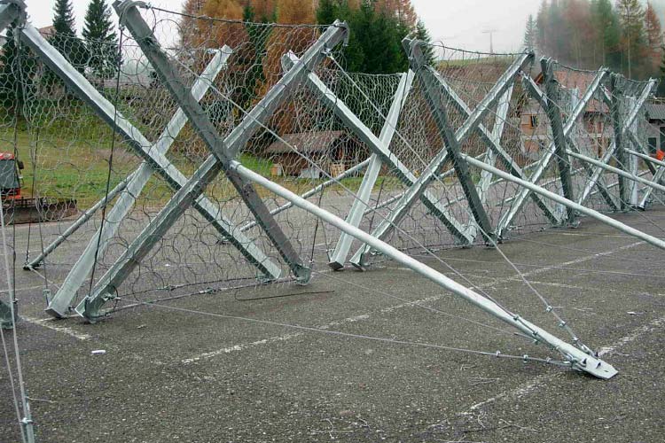 STRUTTURA DI INTERCETTAZIONE E/O CONTENIMENTO, formata da pannelli di rete in fune con formazione a trefoli di filo d’acciaio zincato, a nodi borchiati o, a richiesta, in rete formata da anelli concatenati a 4 punti di contatto, cui è sovrapposta ed accoppiata una rete a maglia esagonale a doppia torsione, atta ad impedire il passaggio della neve incoerente; il pannello è bordato con una fune perimetrale con formazione a trefoli di filo d’acciaio zincato;